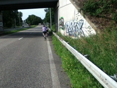 Deux carrefours giratoires plus loin et avec la complicité de Martin, nous nous retrouvions déjà engagé sur une autoroute. On s’est vite aperçu que les bruits de klaxon, ce n’était pas pour célébrer cet instant de première mondiale. Les vélos n’y étaient pas autorisés!!! Avez-vous déjà viré de bord sur une autoroute en portant un vélo à bout de bras pour sauter la clôture médiane avec des souliers à clips. On l’a fait!