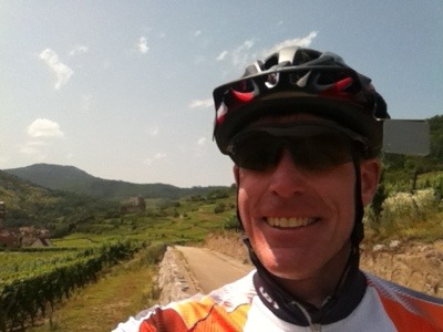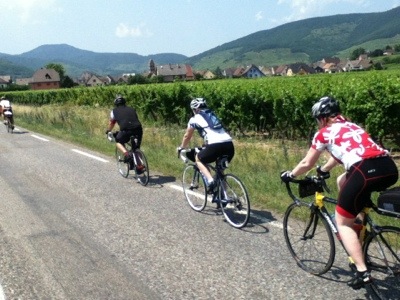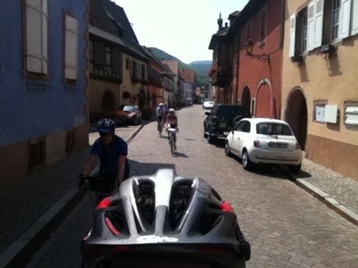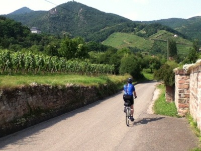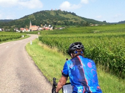 Dès qu’on a enfourché nos vélos, on s’est mis à suer pas à peu près. Pour être sûr que la sensation moite durerait, la montée pour aller de Eguisheim au Château de Hohlansdsbourg, entre le 6e et le 14e km, avait une pente qui variait de 10% à 16%… Comment ne pas penser au pourcentage d’alcool dans le vin du repas de ce soir.