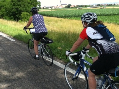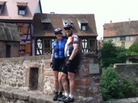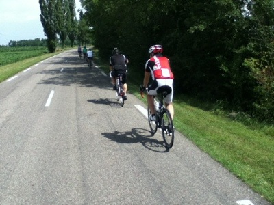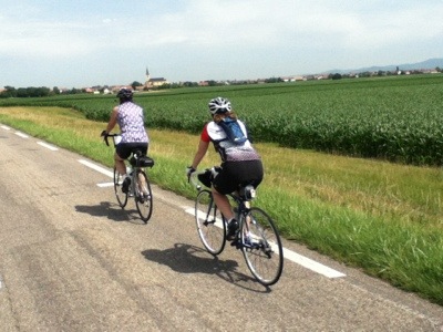 On a mis peu de temps à découvrir que Johanne et Didier forment un charmant couple. Didier a eu le malheur de coincer son pneu dans une crevasse et a fait une chute. Johanne, sûrement par empathie, a cru bon faire la même chute au même endroit. Les deux s’en sont tirés avec quelques éraflures et Didier, un coude endolori. En fin de journée, on s’approchait de la D201 en route vers Colmar sur une piste cyclable traversant un champ de maïs. Un gicleur à haut débit crachait en saccade. Un des jets a pratiquement noyé Johanne et le jet suivant, inondé Didier. Je roulais entre les deux et, comme par magie, je n’ai pas été touché. Deux personnes peuvent-elles être plus en symbiose que ça?